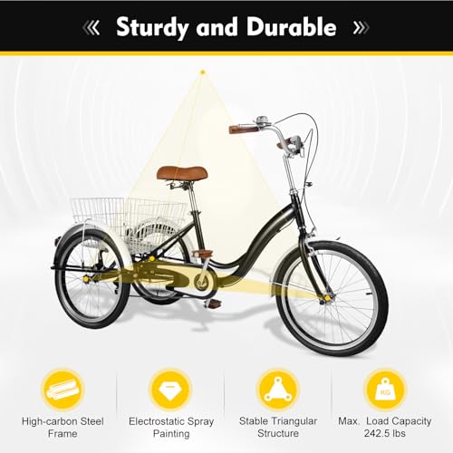BAOCHADA Driewieler voor volwassenen, 20 inch, 3 wielen, koolstofstaal, voor volwassenen, driewieler, 3 wielen, fiets met boodschappenmand, outdoor fietsen, in hoogte verstelbaar, voor ouderen tot 110