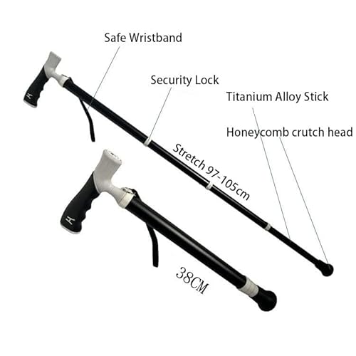 ★Handgreepmodus, met veiligheidspolsband, flexibel veiligheidsslot van het staaflichaam, staaflichaam van titaniumlegering, 97-105 cm honingraat antislipkop na verlenging, lengte 38 cm.